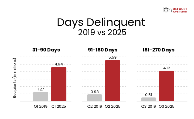 This date marks a pivotal second for establishments. Whereas the executive course of takes time, these debtors are actually crossing into default standing, launching the disaster that instantly impacts your Cohort Default Fee (CDR). With an unprecedented 6 million debtors delinquent throughout the FSA portfolio, it is a dwell disaster that calls for rapid consideration to mitigate the fallout.